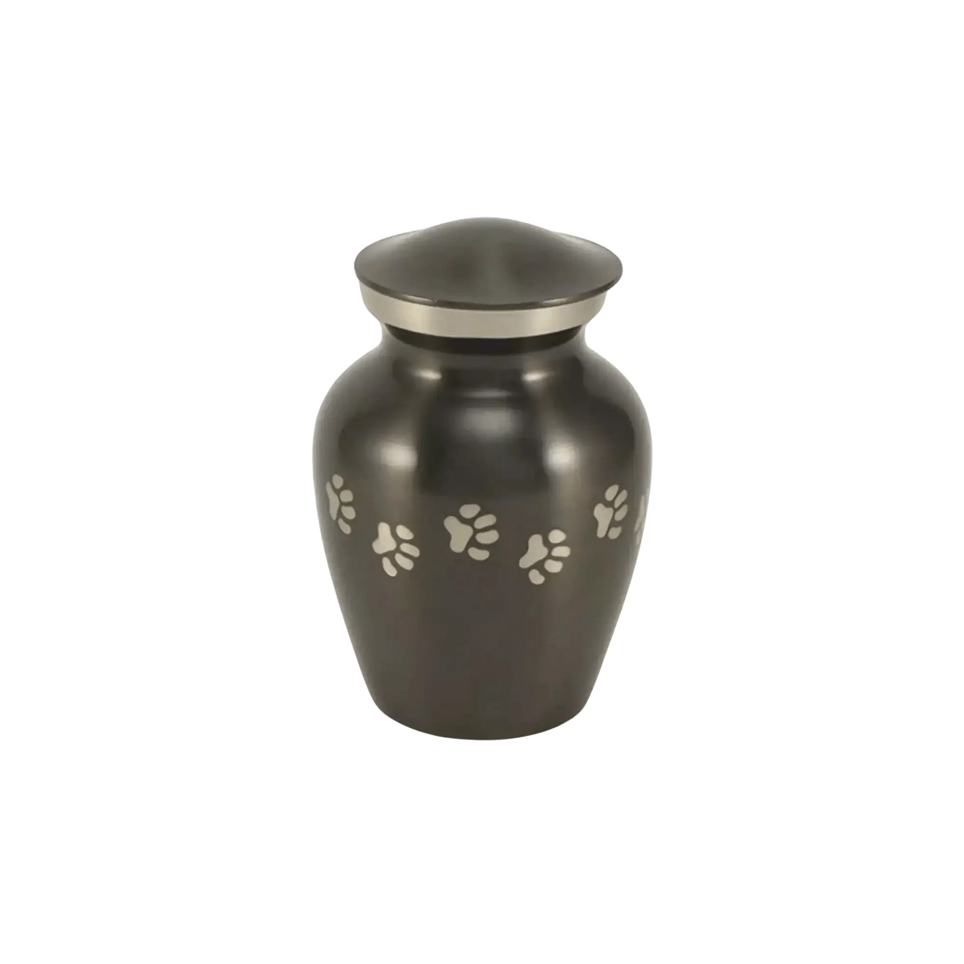 - UNIQUE DESIGN. Made of brass in a slate finish, featuring golden paw print on the urn.